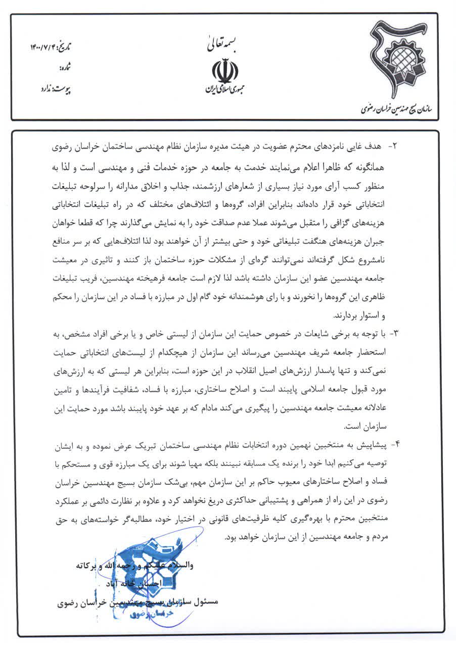 3- با توجه به برخی شایعات در خصوص حمایت این سازمان از لیستی خاص و یا برخی افراد مشخص، به استحضار جامعه شریف مهندسین می رساند این سازمان از هیچکدام از لیست های انتخاباتی حمایت نمی کند و تنها پاسدار ارزش های اصیل انقلاب در این حوزه است، بنابراین هر لیستی که به ارزش های مورد قبول جامعه اسلامی پایبند است و اصلاح ساختاری، مبارزه با فساد، شفافیت فرآیند ها و تامین عادلانه معیشت جامعه مهندسین را پیگیری می کند مادام که بر عهد خود پایبند باشد مورد حمایت این سازمان است.