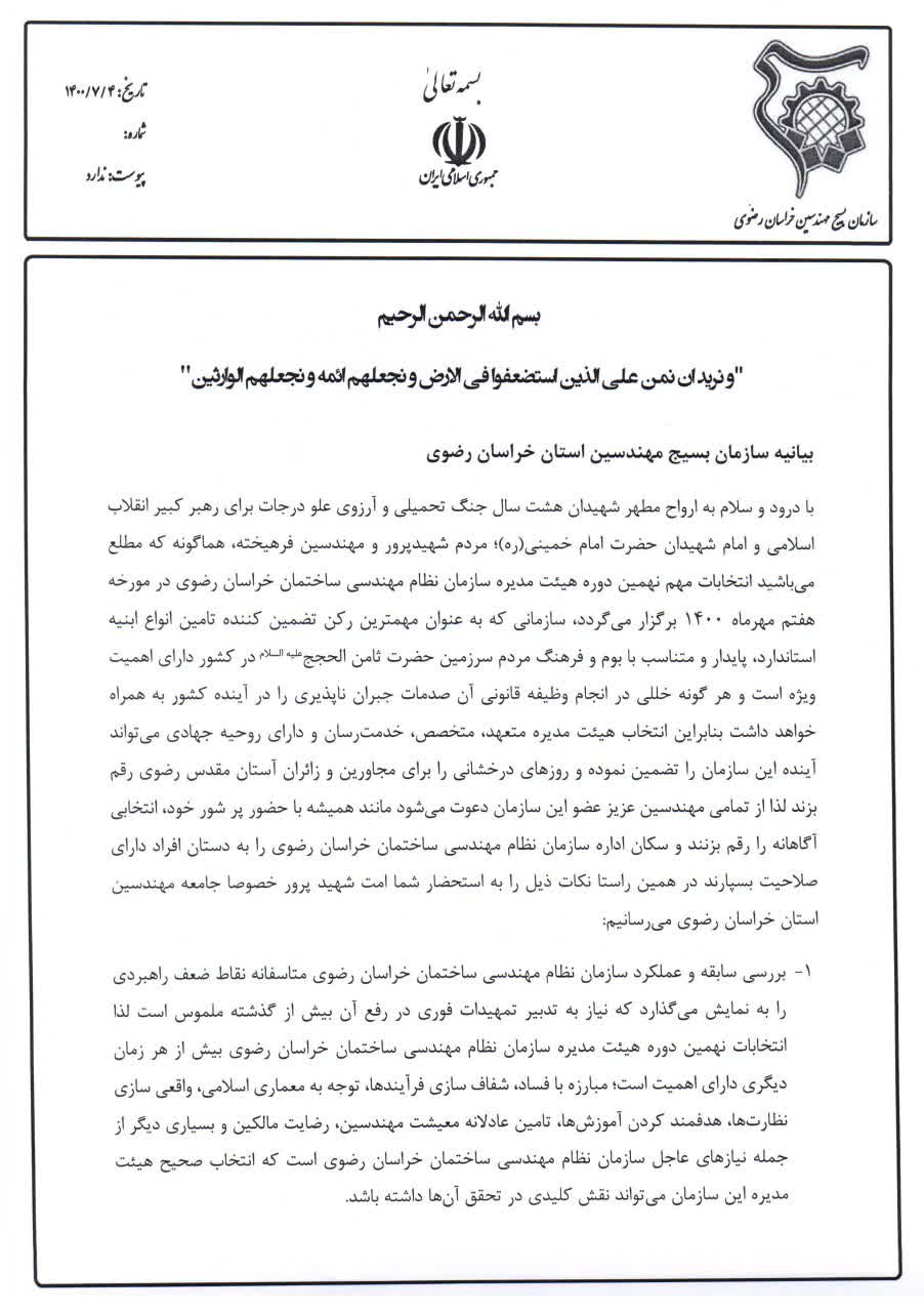بیانیه سازمان بسیج مهندسین صنعت و معدن خراسان رضوی در آستانه انتخابات نظام مهندسی ساختمان
